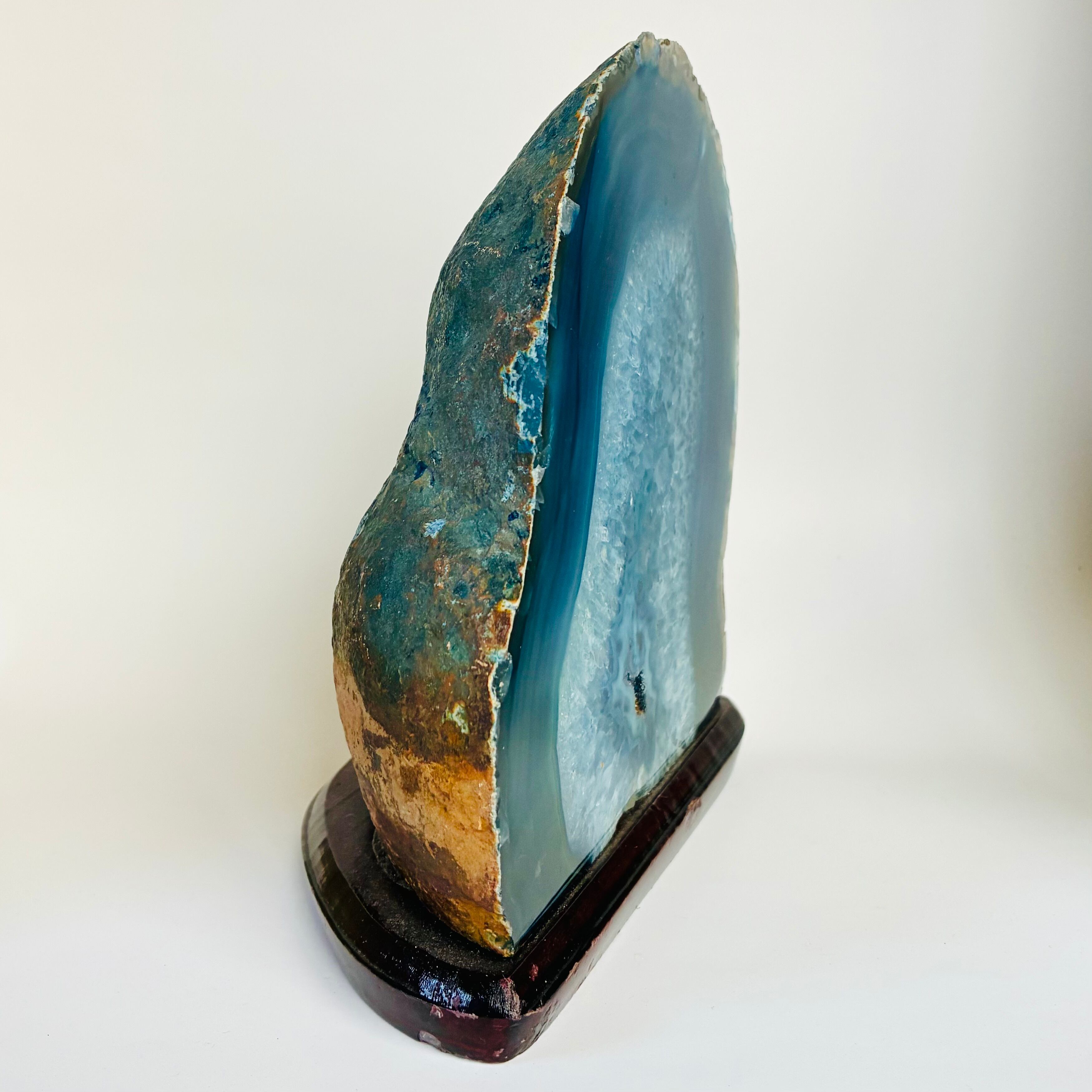 まるで小さな宇宙のような美しさを感じる青の瑪瑙(メノウ)。偶然生まれる神秘的な模様を持つ天然の鉱物です。こちらは、長く伸びた形のジオード(晶洞)で、あまり見かけないシルエットです。